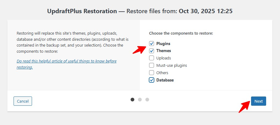 - Click the Restore button to restore the website to the backup state you selected.You can choose which content to restore, such as plugins, themes, and the database (where posts and products are stored). Of course, you can also restore everything.