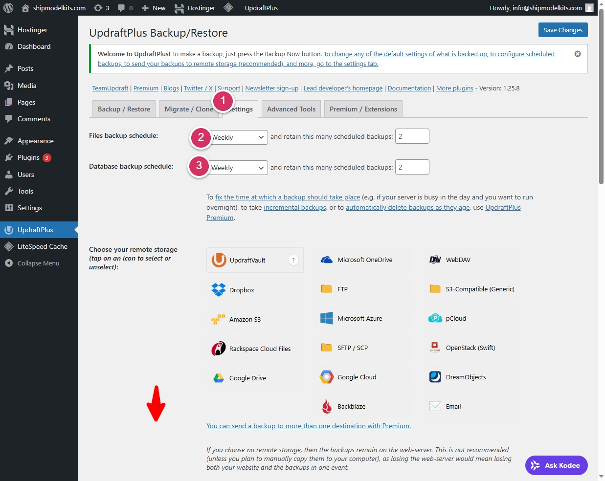 Go to Plugins → Installed Plugins → UpdraftPlus → Settings.